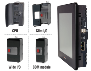 Super compacts, les 5″, 7", 10,1″ ou 15.6" et 5″, 7" ou 10,1″ Pro sont des contrôleurs où l'automate, l'IHM et les E/S sont intégrés dans une seule unité et dans une gamme de configurations d'E/S intégrées.