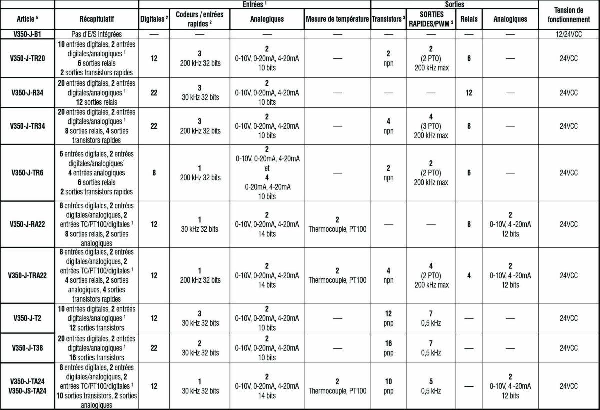 1 Selon les modèles, certaines entrées peuvent nécessiter de procéder à un câblage et à un paramétrage du logiciel et peuvent fonctionner en tant qu'entrées digitales, rapides, analogiques, et sur certains modèles, en tant que TC ou PT100. L'adaptation exige des broches d'entrée. Ceci réduit le nombre d'entrées digitales. Broches