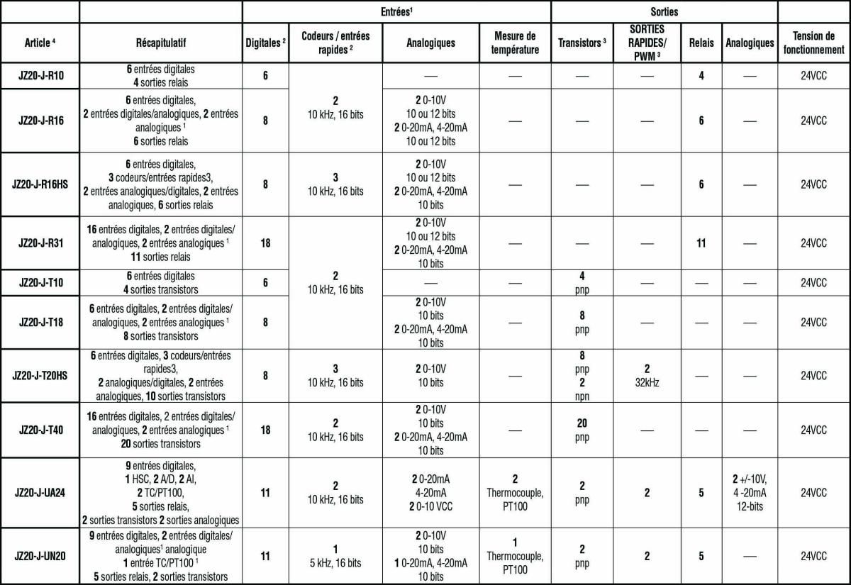 1 Selon les modèles, certaines entrées sont adaptables et peuvent fonctionner en tant qu'entrées digitales ou analogiques. L'adaptation exige des broches d'entrée. Ceci réduit le nombre d'entrées digitales. Broches requises : chaque entrée analogique exige 1 broche.
